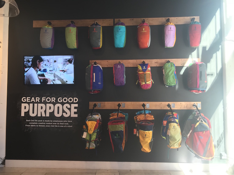 IMG_6983 Published November 30, 2017 at 767 × 575 in Salt Lake businesses giving back A backpack display on the right front wall of the Cotopaxi store.