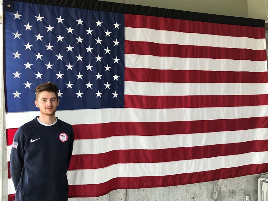 IMG_2879 Published April 2, 2018 at 853 × 640 in All Rhoads lead to the Olympics Rhoads smiles in front of the American flag displayed in the judges box at the top of the K120 hill.