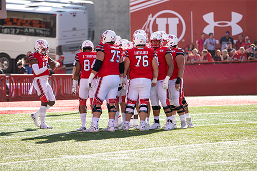 0I1A0605 Published November 25, 2019 at 500 × 333 in Expansion of Rice-Eccles Stadium University of Utah Offense huddles to hear the next play call.