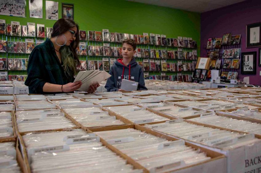 bcc_10 Published April 1, 2019 at 1824 × 1216 in bcc_10 Taylor Hoffman, an employee at Black Cat Comics in Salt Lake City, helps Luke Paramoure, 12, find a particular issue of a comic book.