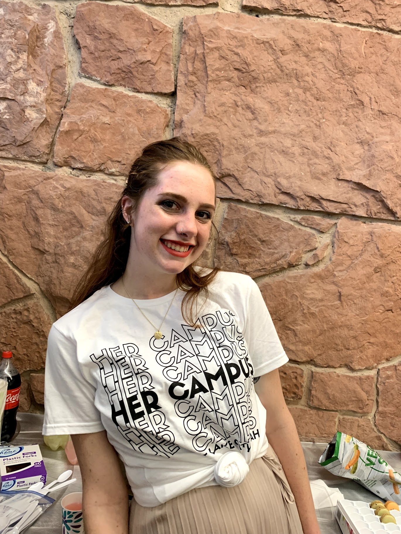 emily-her-campus-1 Published April 15, 2019 at 1370 × 1827 in emily-her-campus-1 Emily Albrecht wears a Her Campus shirt at the superlatives banquet on April 10, 2019 in SLC, UT. (AP Photo/Bryn Jorgensen)