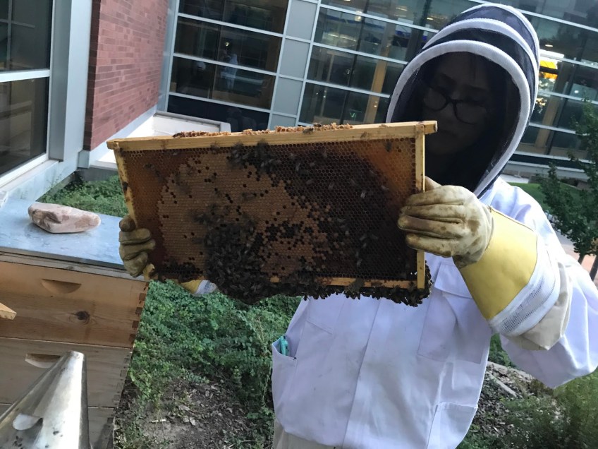 Published November 29, 2017 at 1600 × 1200 in Ben Whisenant Coyne, inspecting a hive frame at the Health Sciences Library (Photo by Henry Allen). Like Loading...