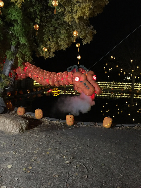 img_17381 Published November 28, 2018 at 450 × 600 in img_17381 A Dragon composed of many pumpkins that has smoke coming from its mouth is being displayed, November 3rd, Salt Lake City, Utah. This piece of artwork is one of Pumpkin Nights most impressive designs.