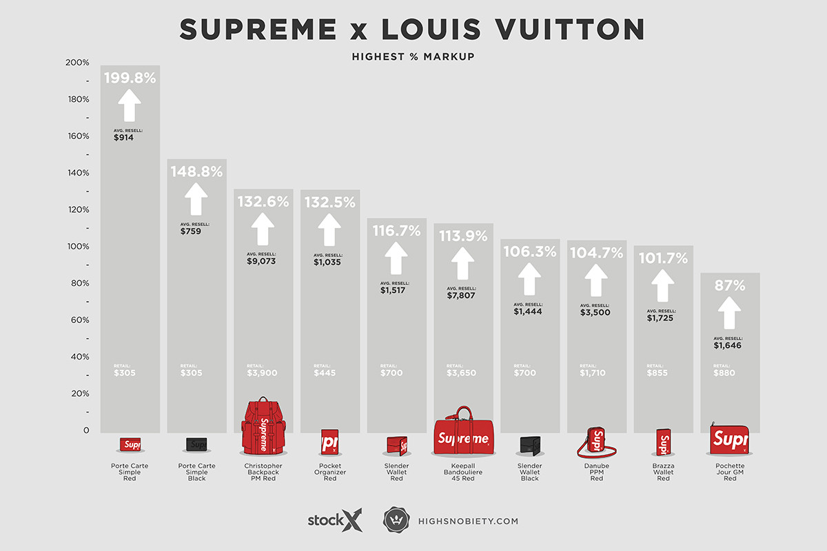 Supreme x Vuitton resale inforgraphic Published November 28, 2018 at 1200 × 800 in Supreme x Vuitton resale inforgraphic Image and research done by HIGHSNOBIETY